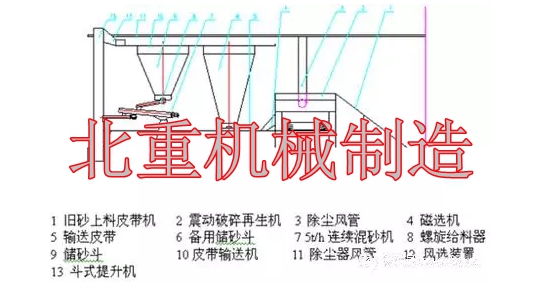人工落砂后,舊砂通過(guò)上料皮帶機(jī)進(jìn)入振動(dòng)落砂機(jī)完成落砂、破碎、篩分,再生,經(jīng)過(guò)帶由磁選的輸送皮帶進(jìn)入斗式提升機(jī),在輸送過(guò)程中人工加入新砂。在斗提的出口處安裝風(fēng)選裝置,經(jīng)過(guò)風(fēng)選的型砂經(jīng)皮帶輸送機(jī)進(jìn)入儲(chǔ)砂斗。劃線(xiàn)平臺(tái)鑄件生產(chǎn)時(shí),型砂從砂斗經(jīng)螺旋給料器進(jìn)入混砂機(jī)。
